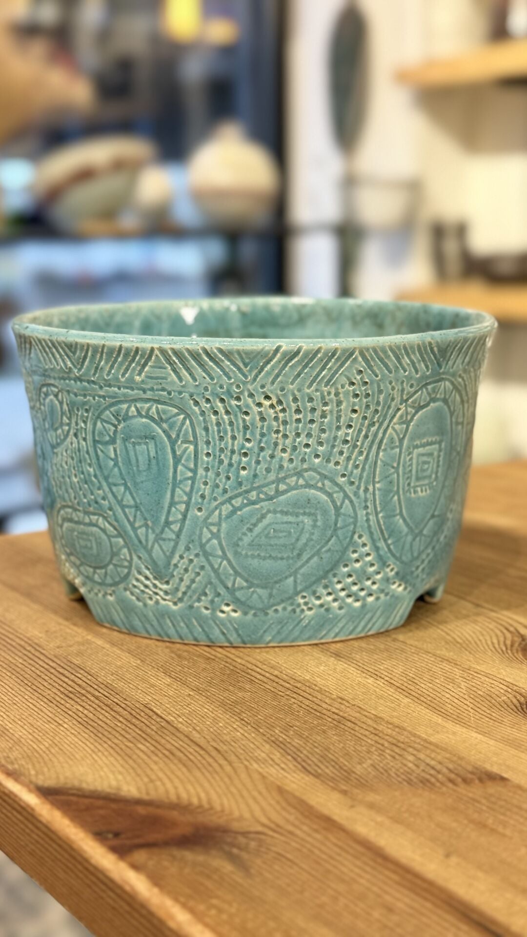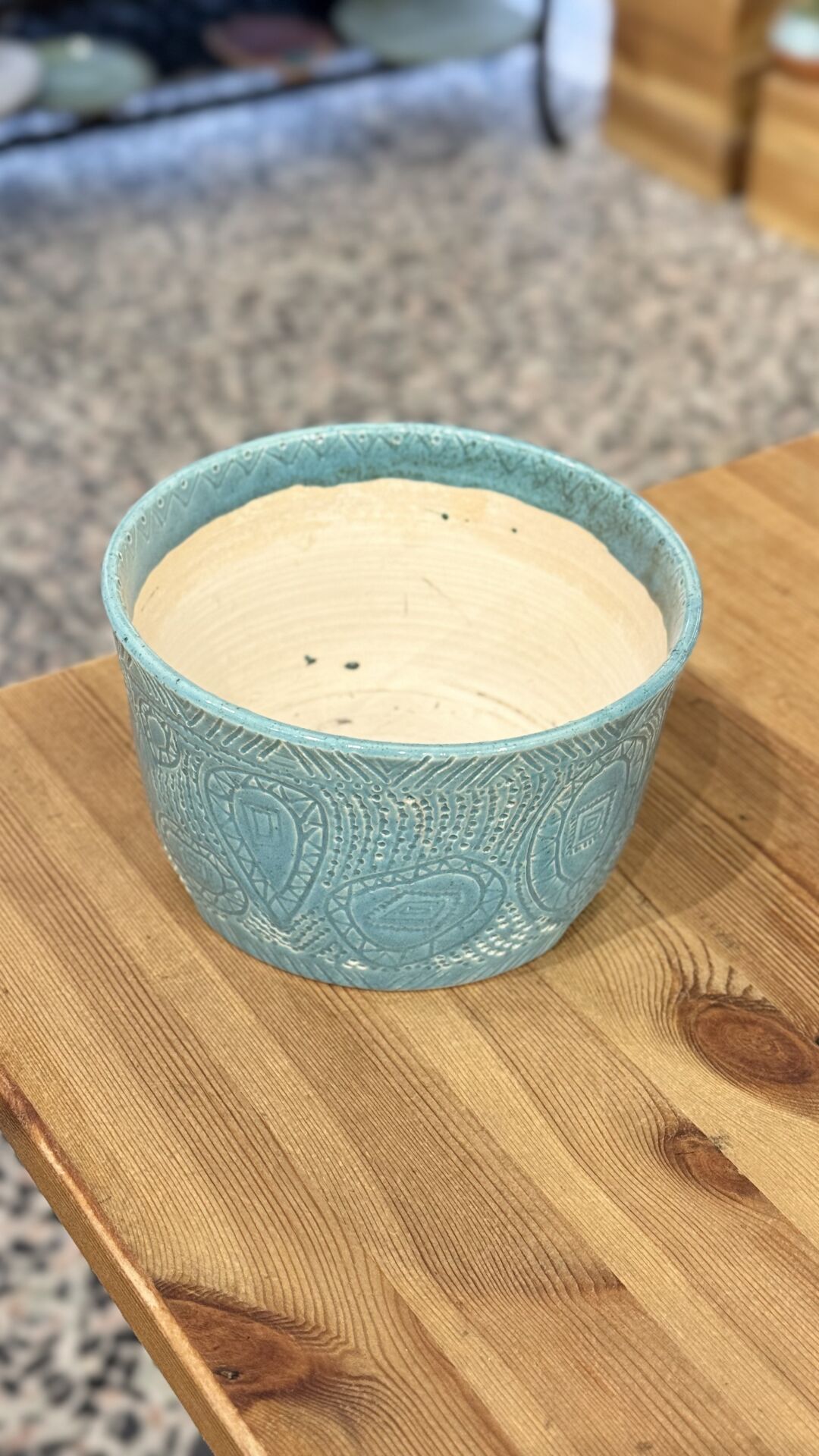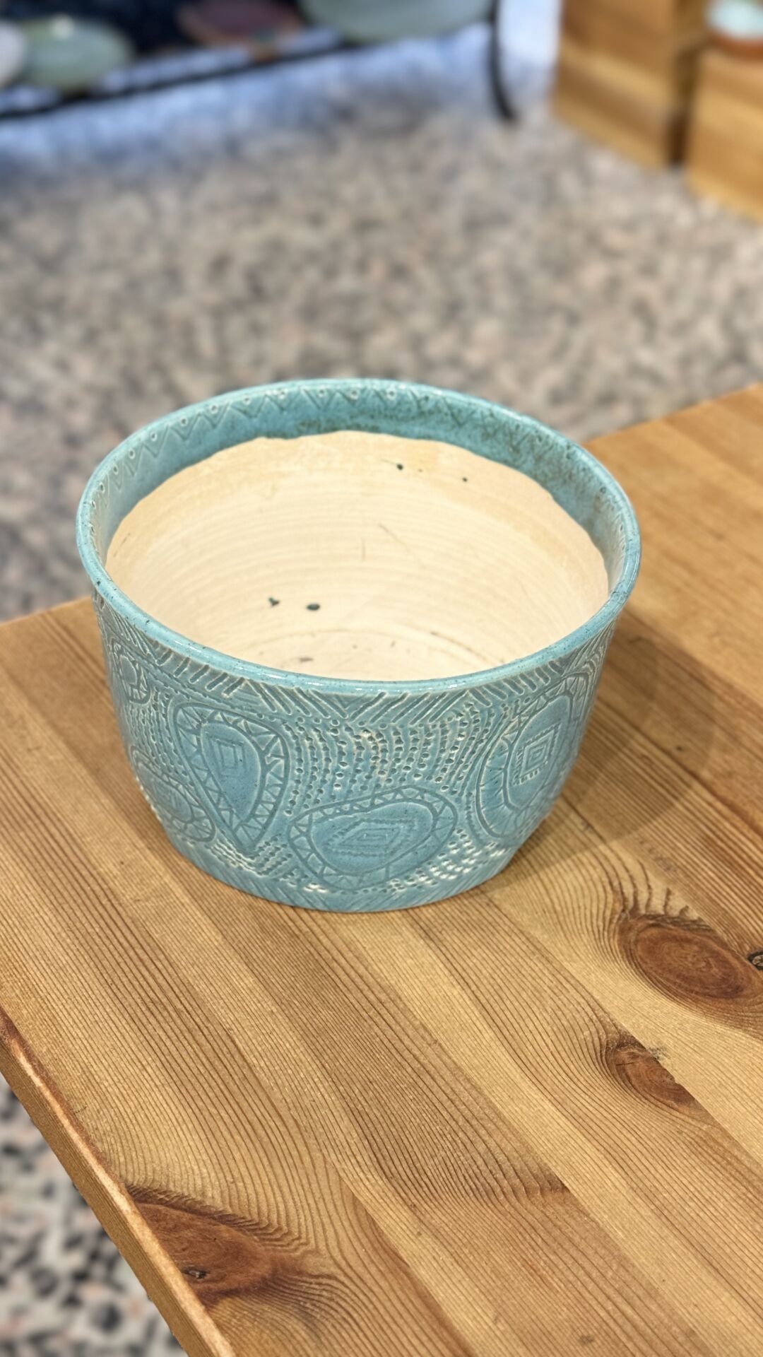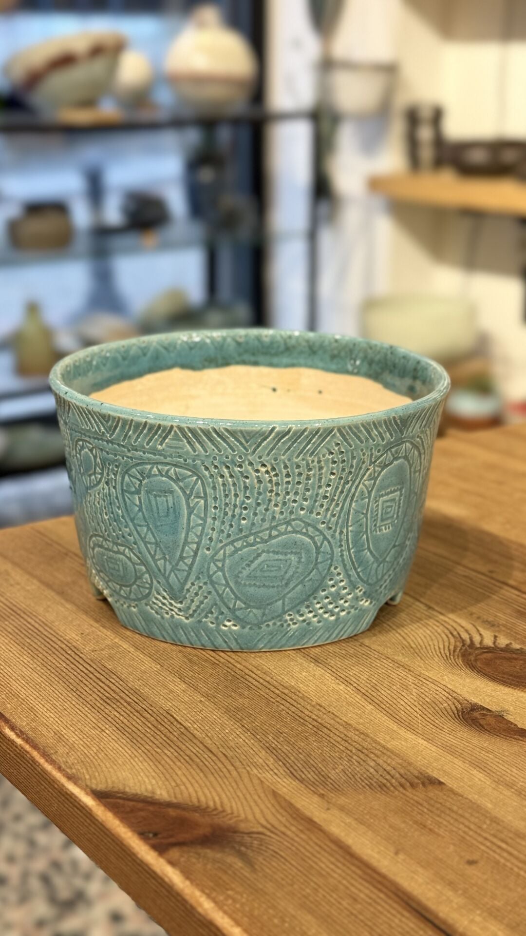 15,5 cam çapında 9 cm yüksekliğinde kazıma tekniği ile desenlendirilmiş seramik saksı.