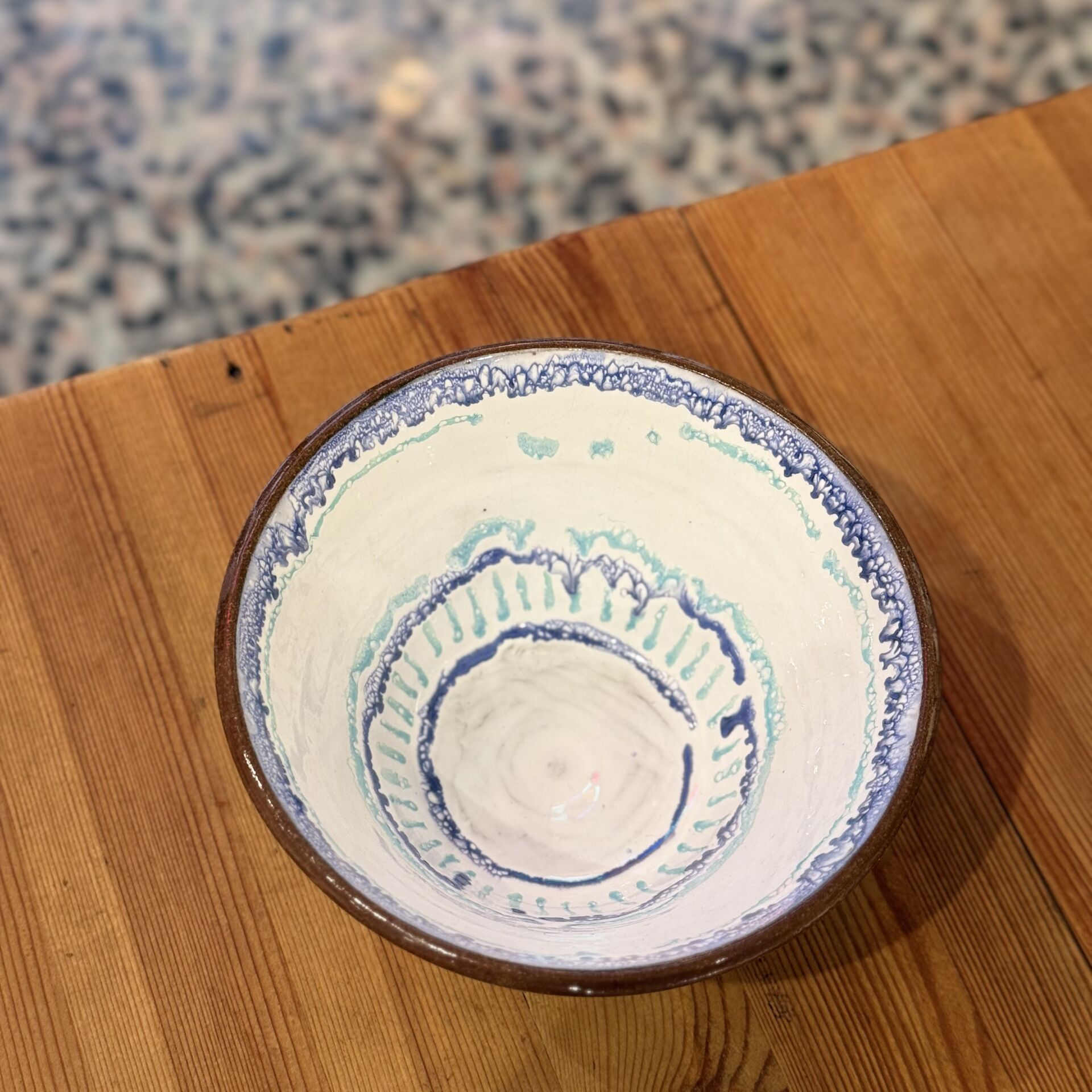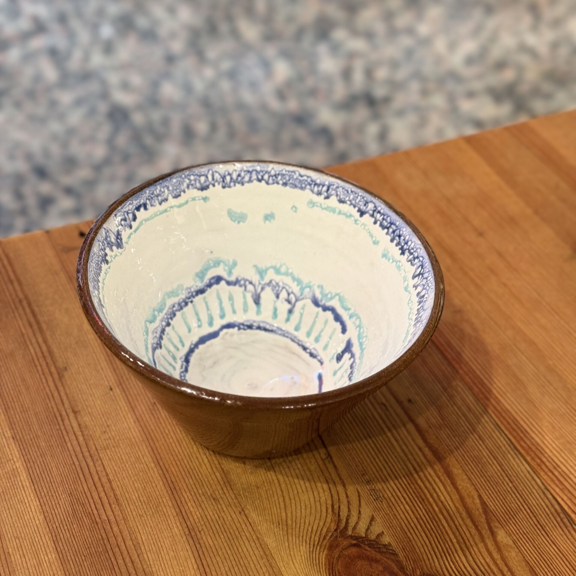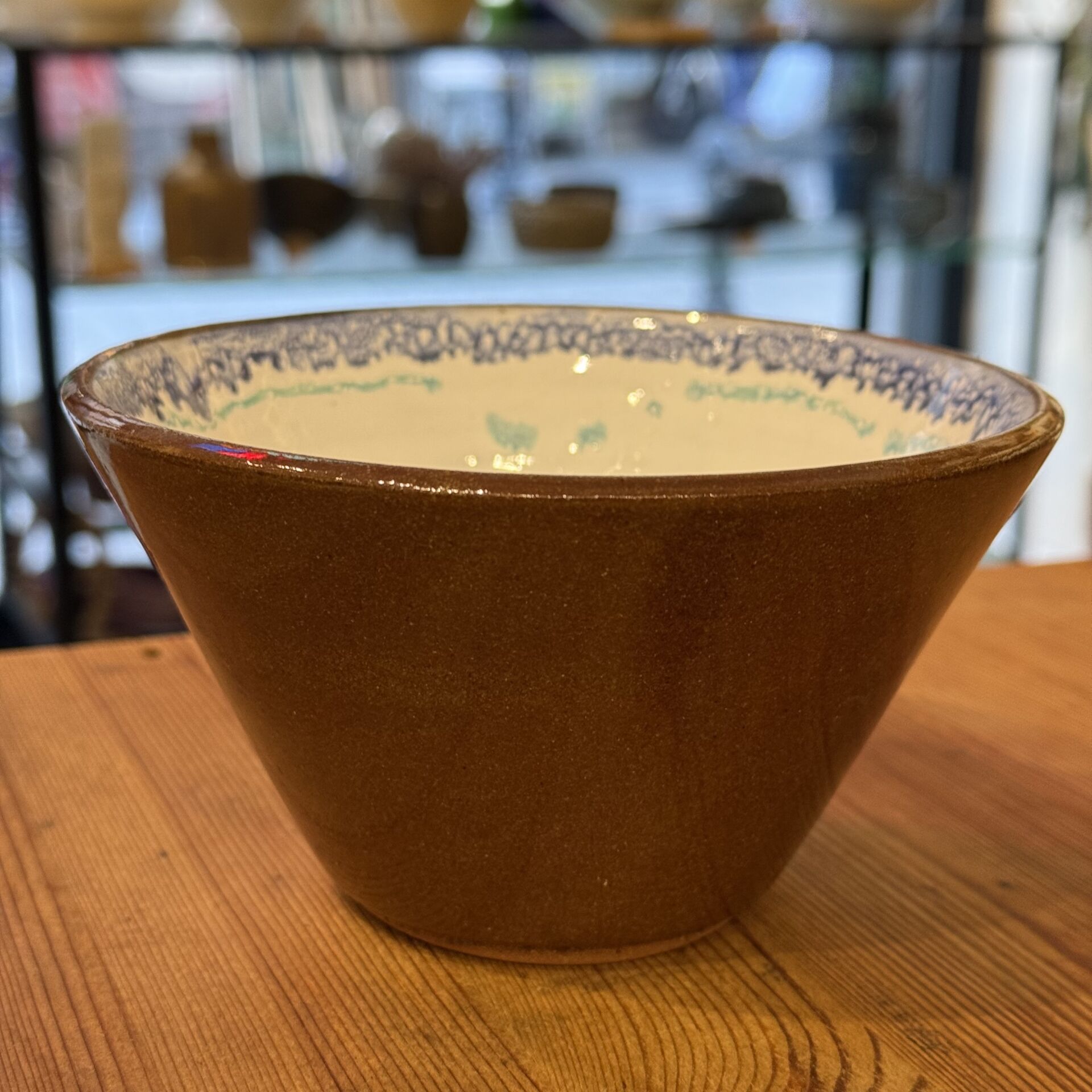 13 cm çapında 7,5 cm yüksekliğinde, kahverengi, içi renk desenli V form seramik kase.
