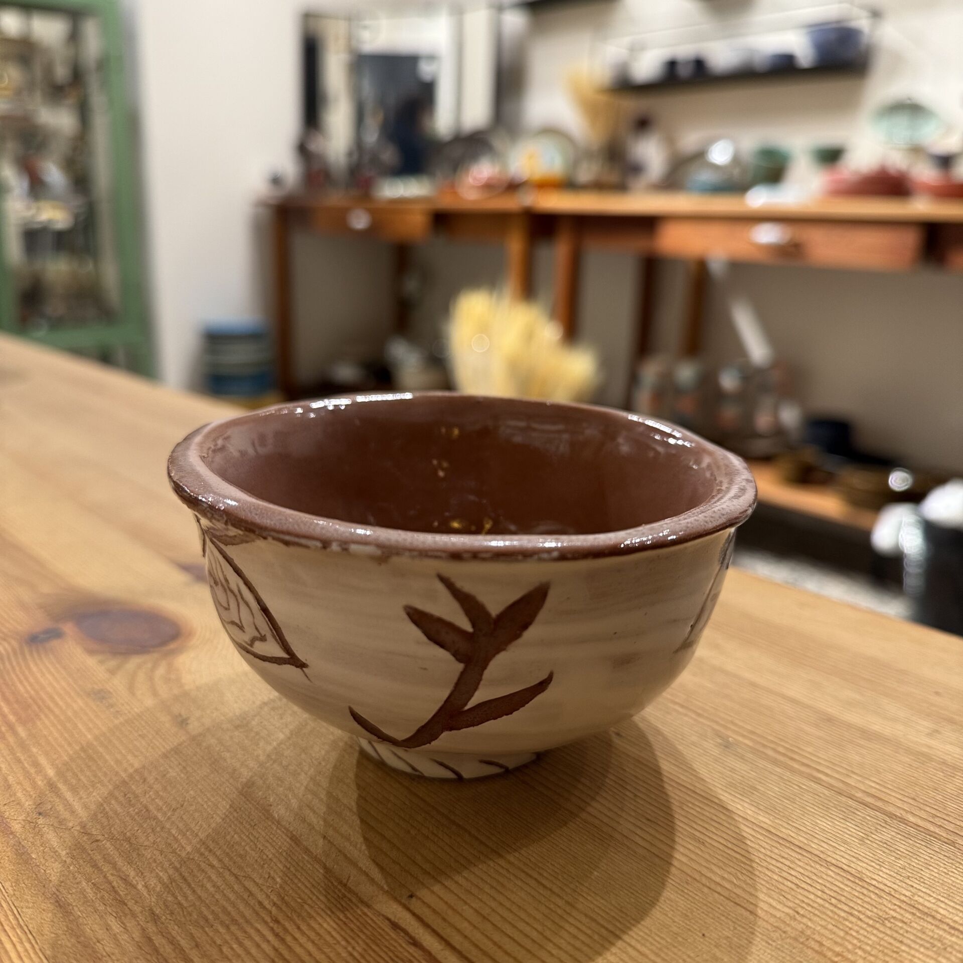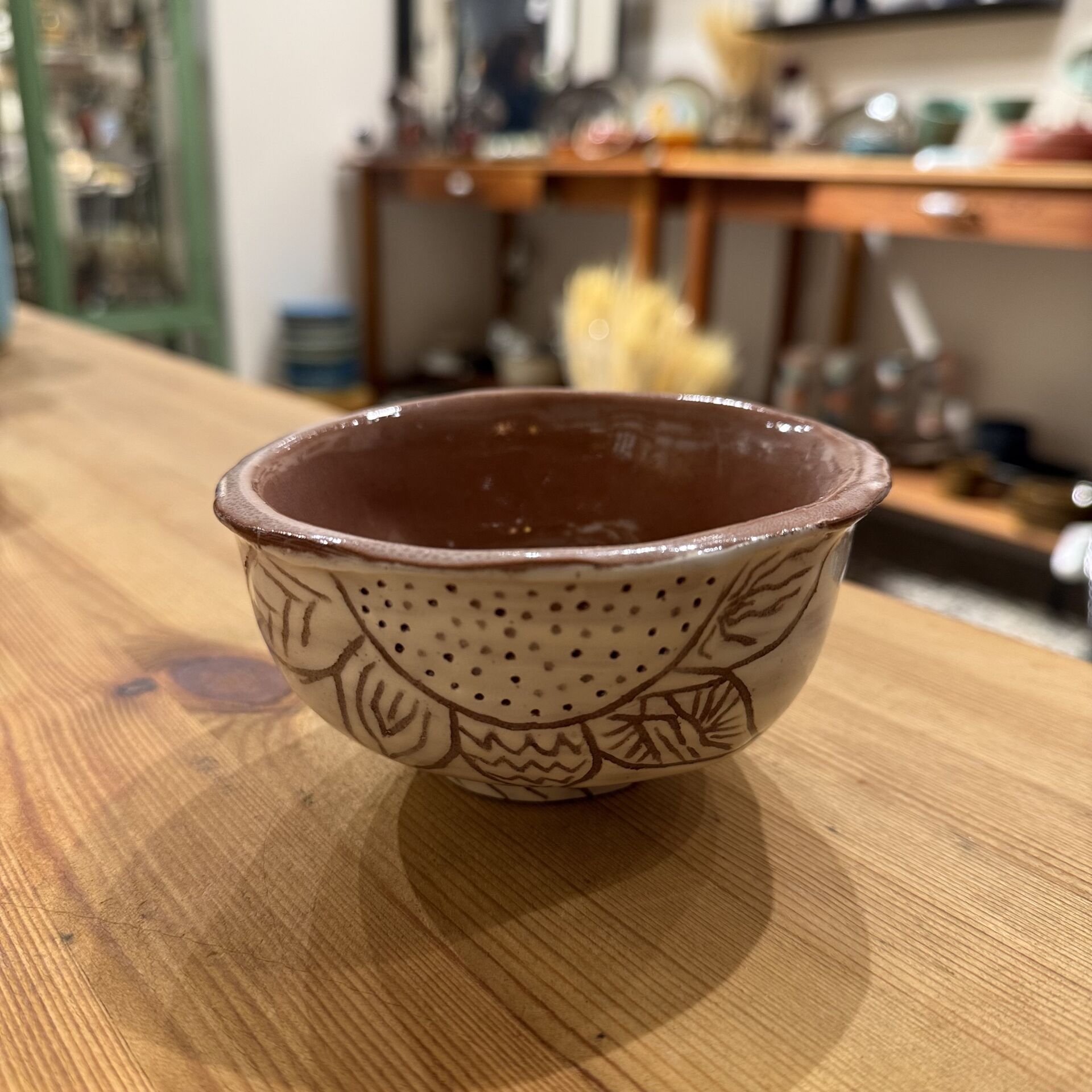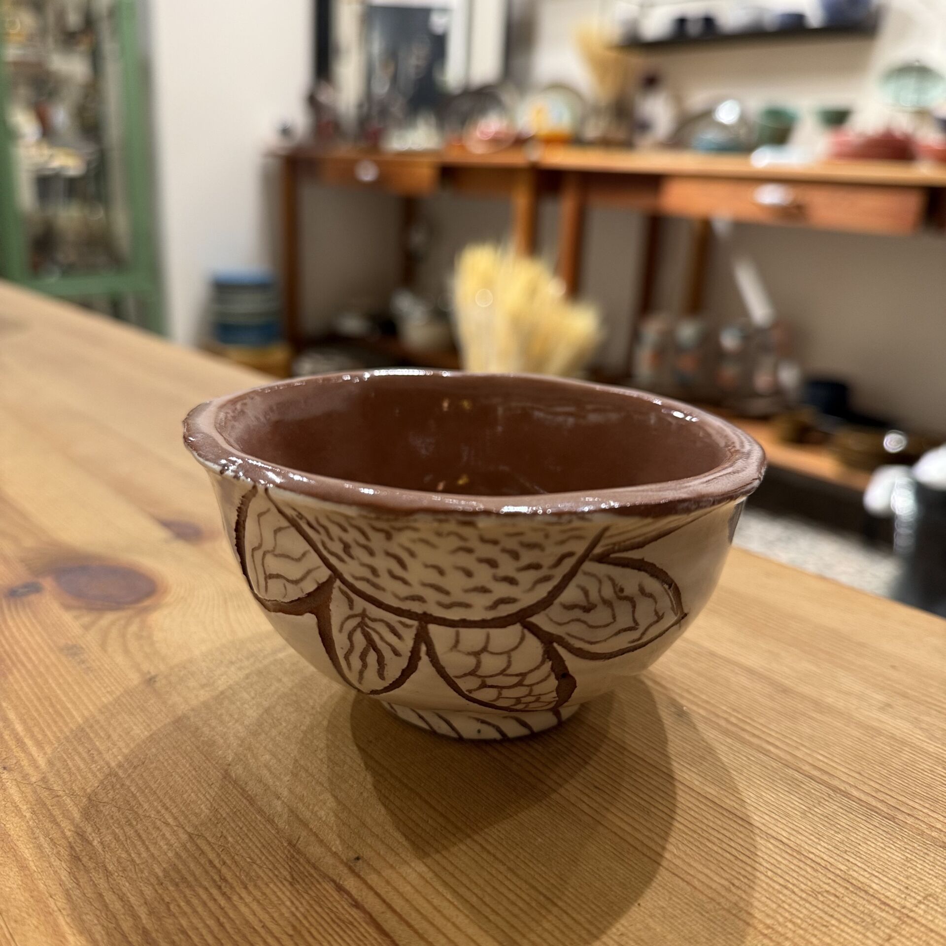 12 cm çapında 6,5 cm yüksekliğinde kazıma tekniği ile desenlendirilmiş çok amaçlı seramik kase.