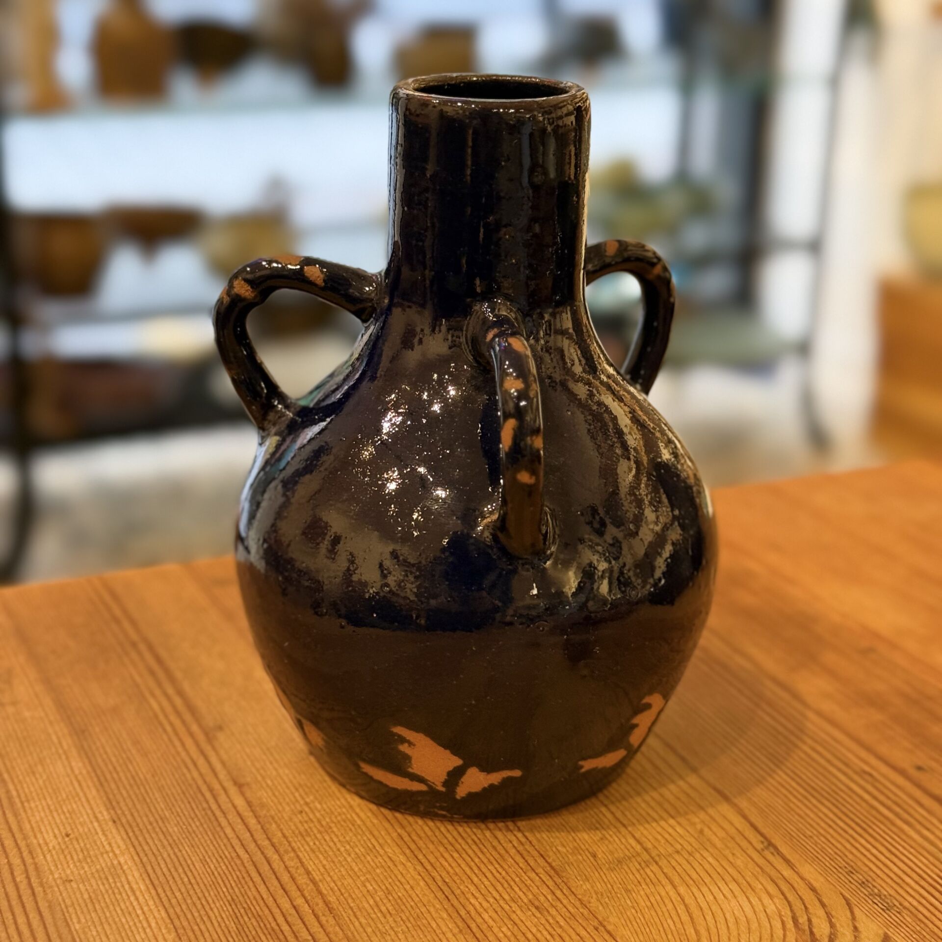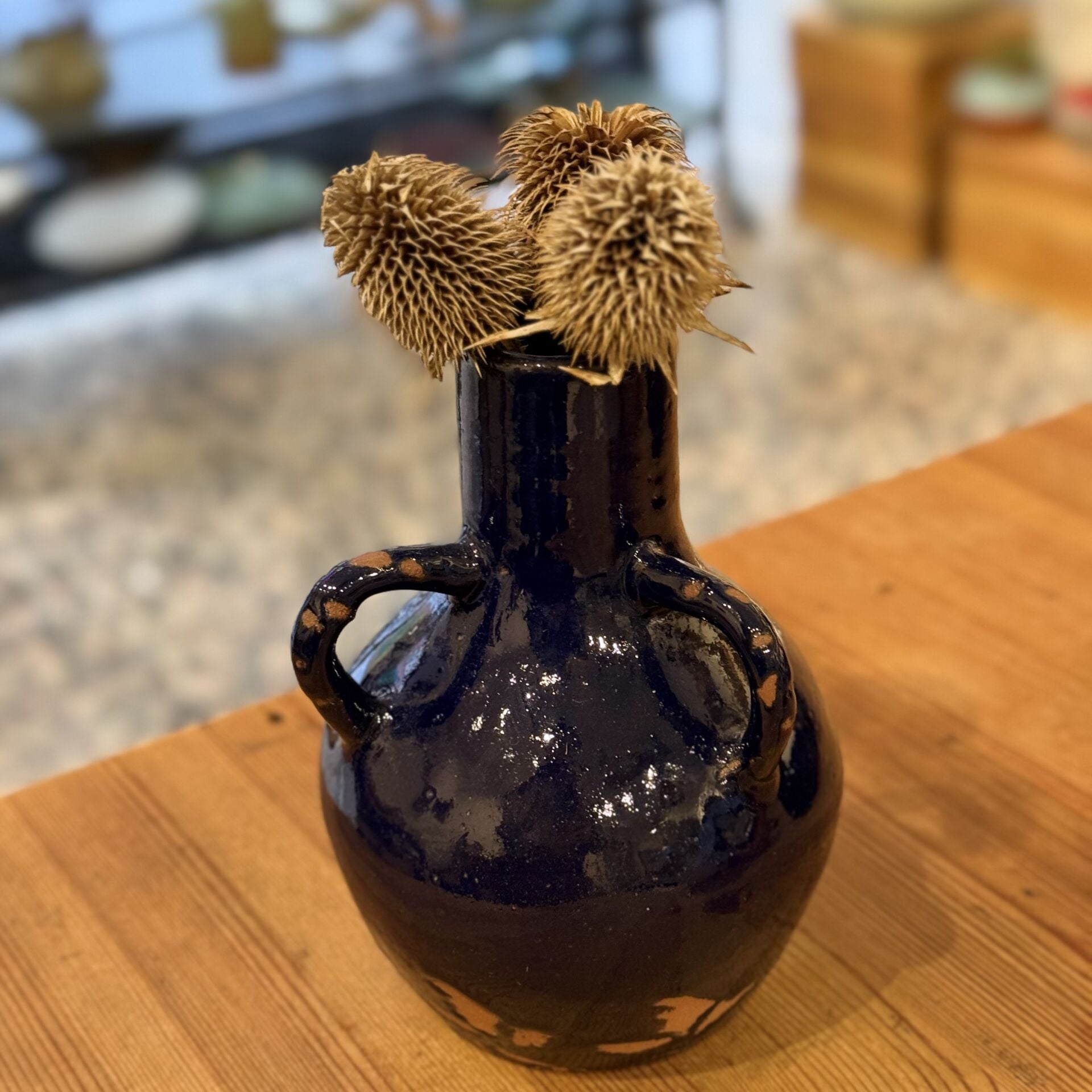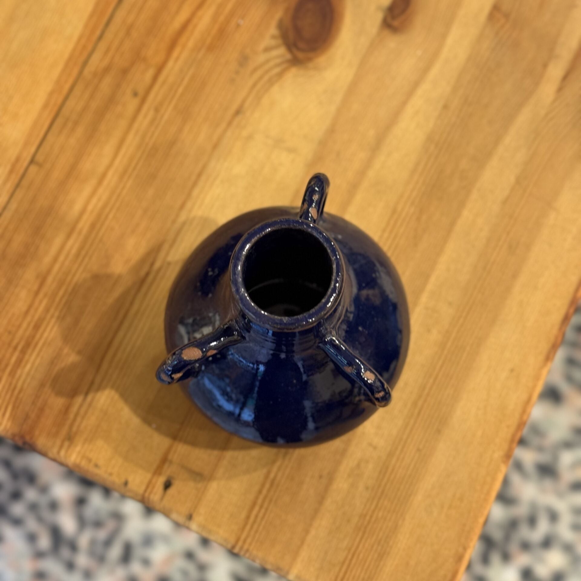 15,5 cm yüksekliğinde kobalt mavisi kulp detaylı dekoratif seramik vazo.