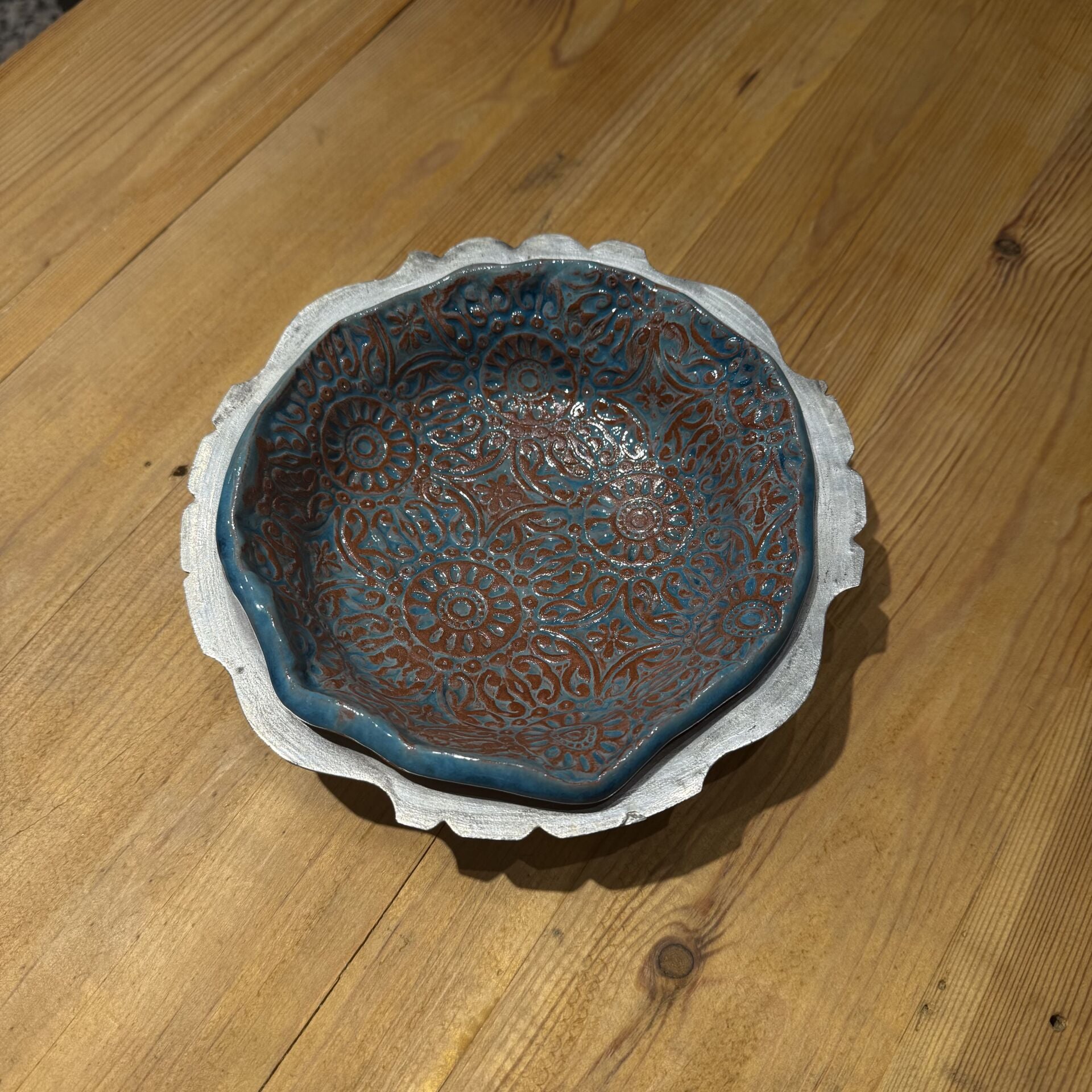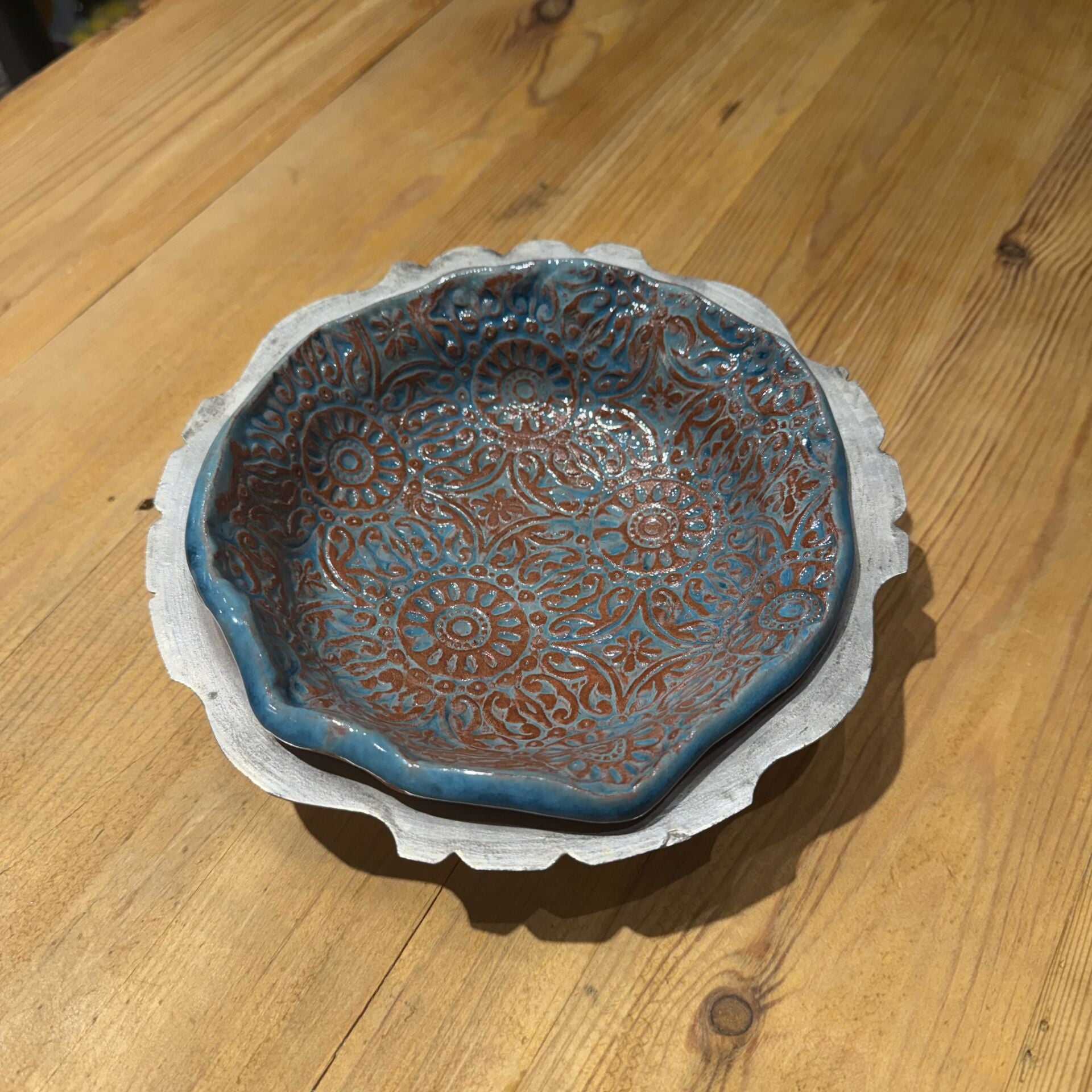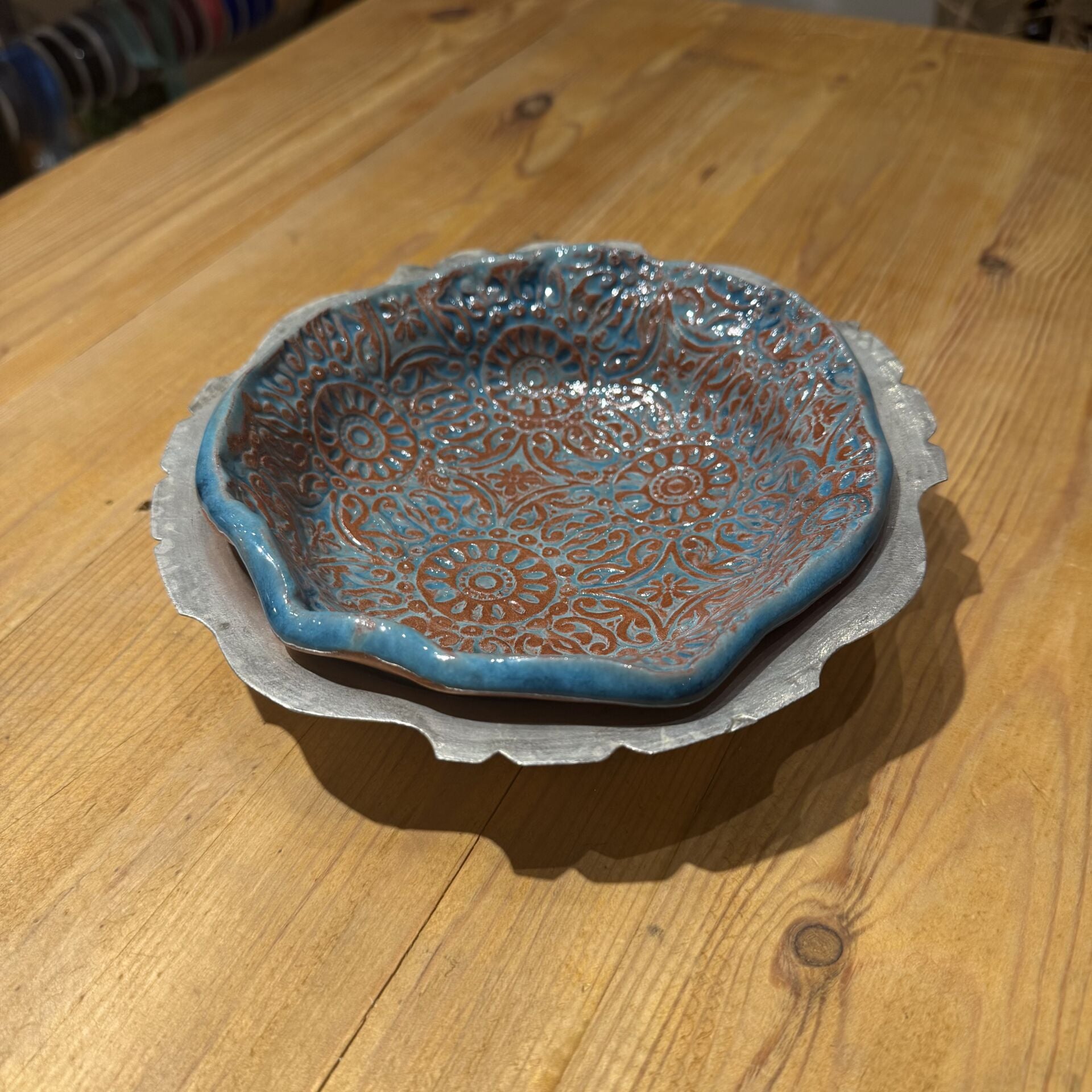 19,5*19,5 cm çapında(bakır kaidesi ile), 2,5 cm derinliği olan desenli seramik tabak.