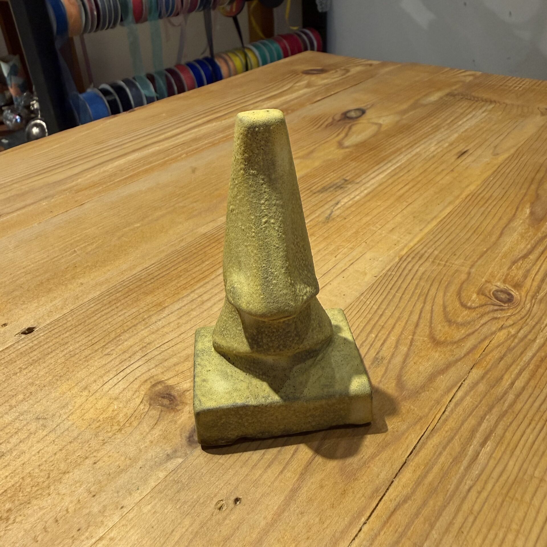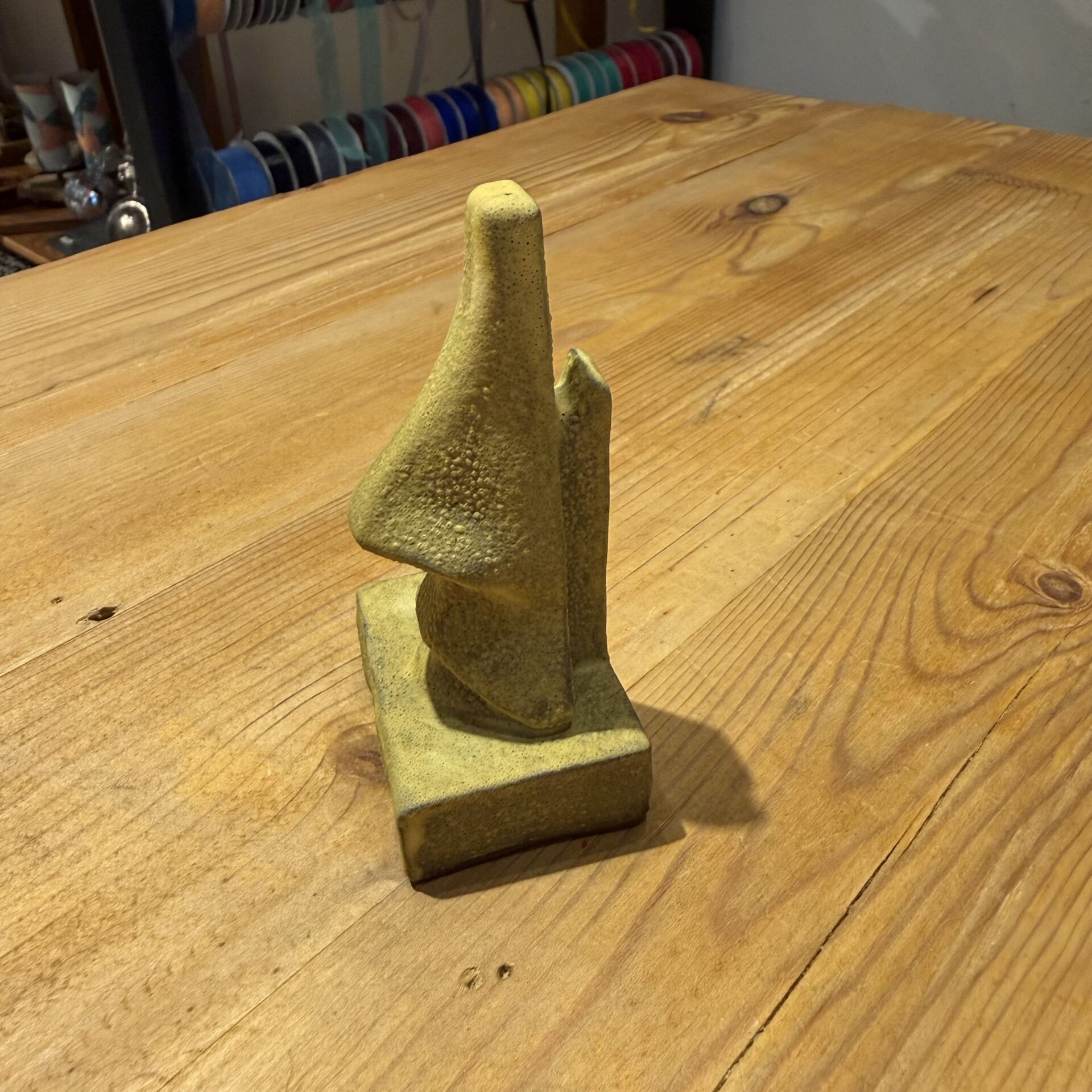 9 cm boyu, 5 cm eni olan sarı renk dekoratif işlevsel seramik obje.