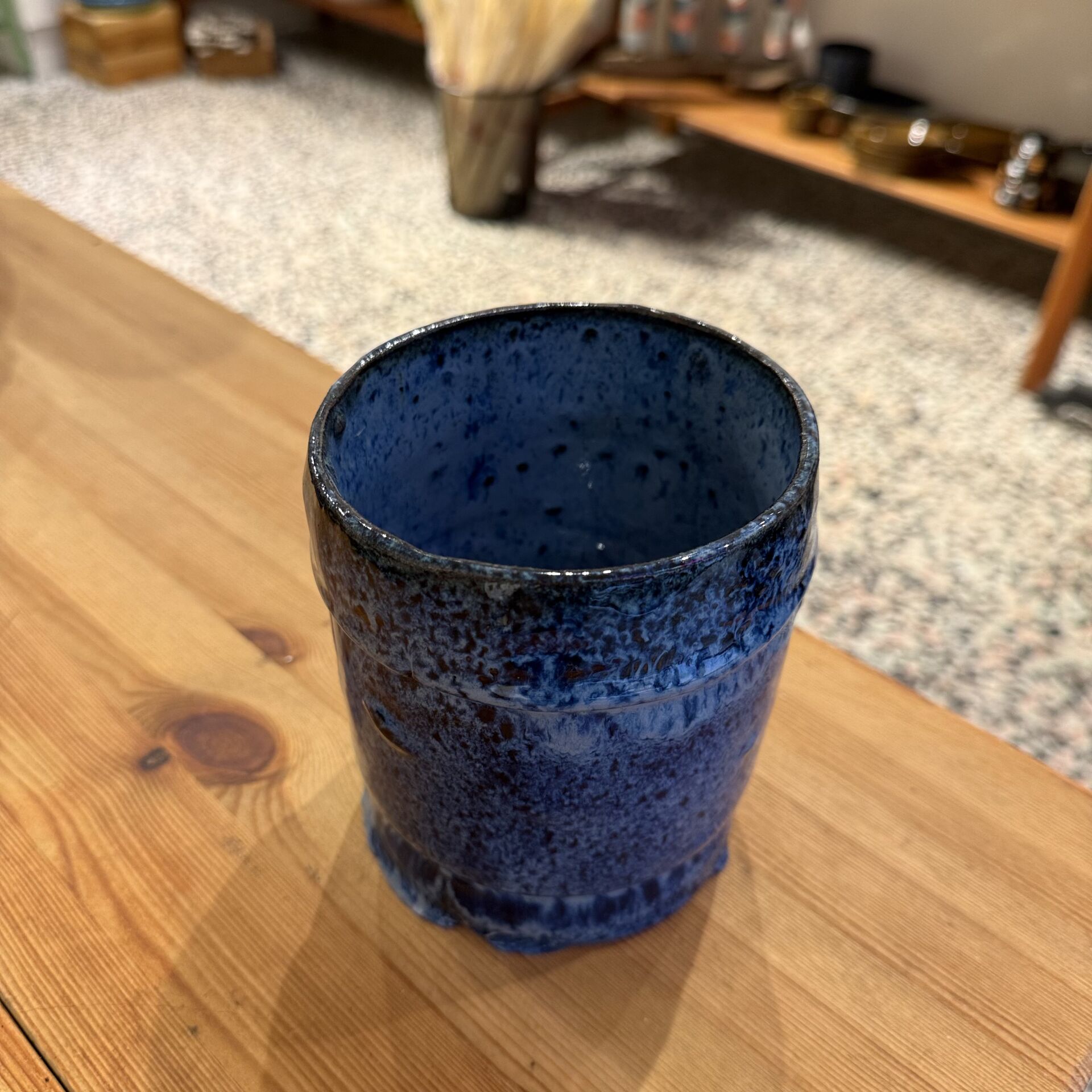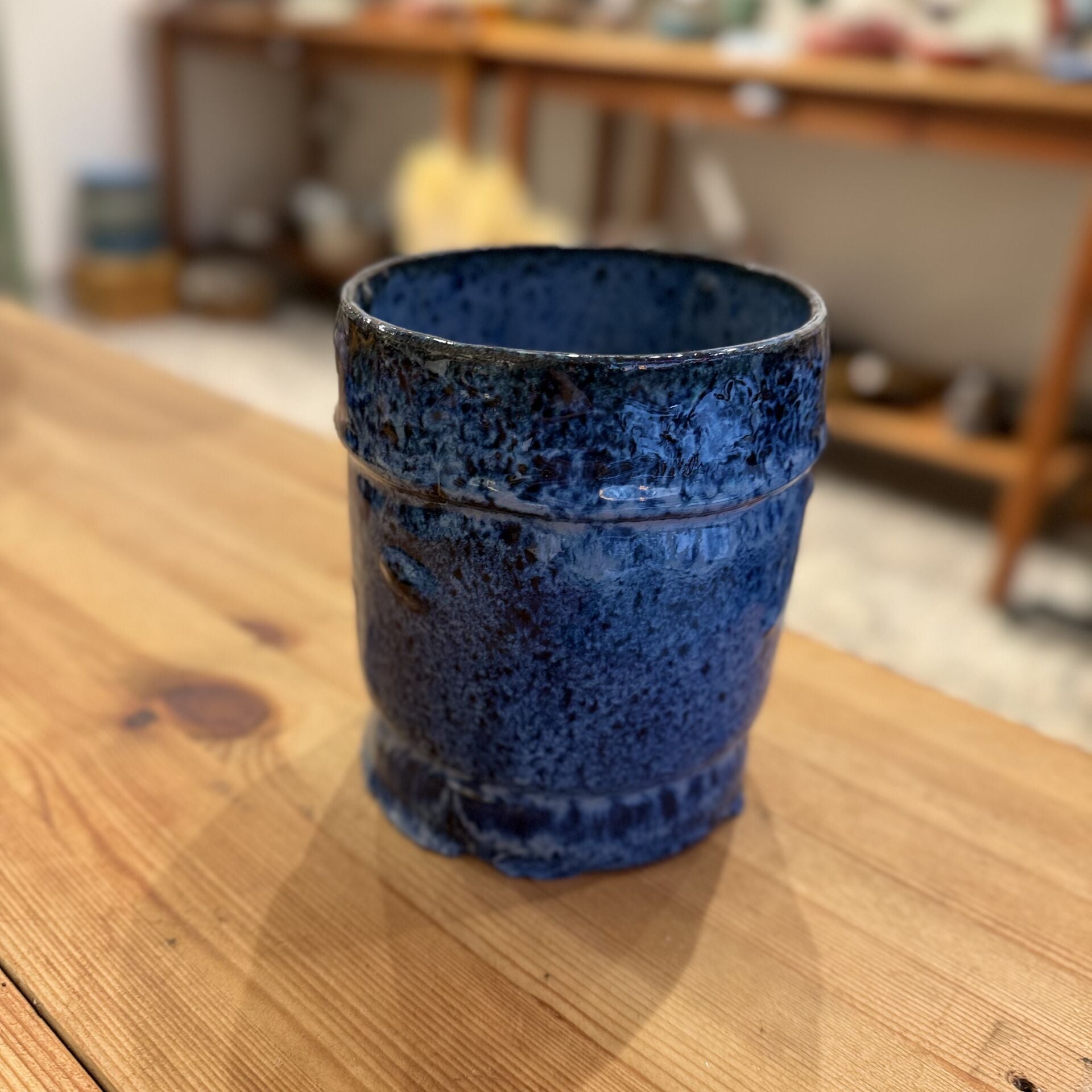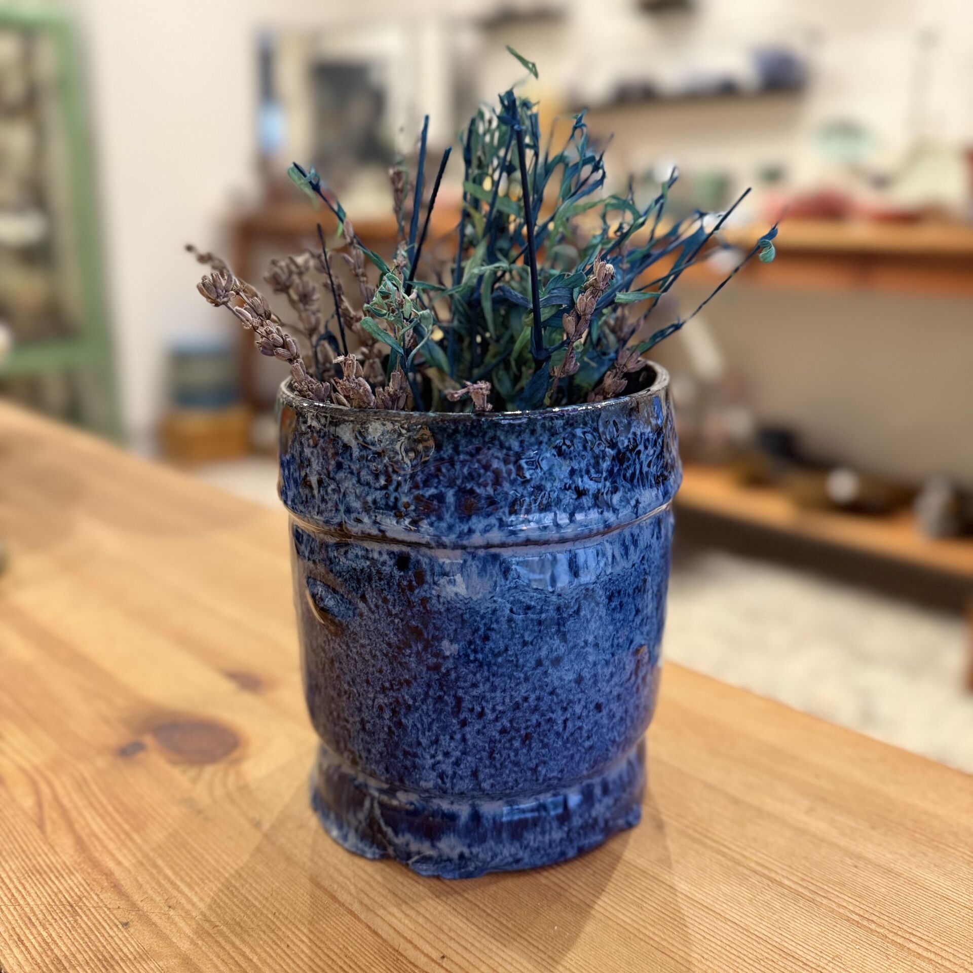 11 cm çapında 13 cm yüksekliğinde lacivert, dekoratif vazo-saksı. Çiçekler dahil değildir.