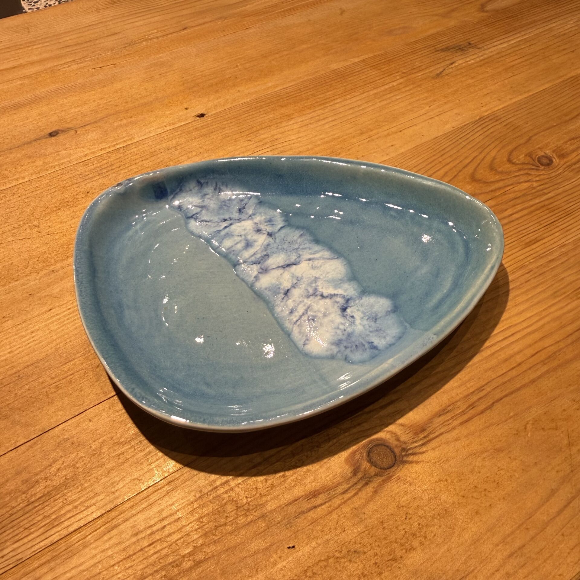 17x13 cm ebatlarında mavi renkte, asimetrik seramik tabak.