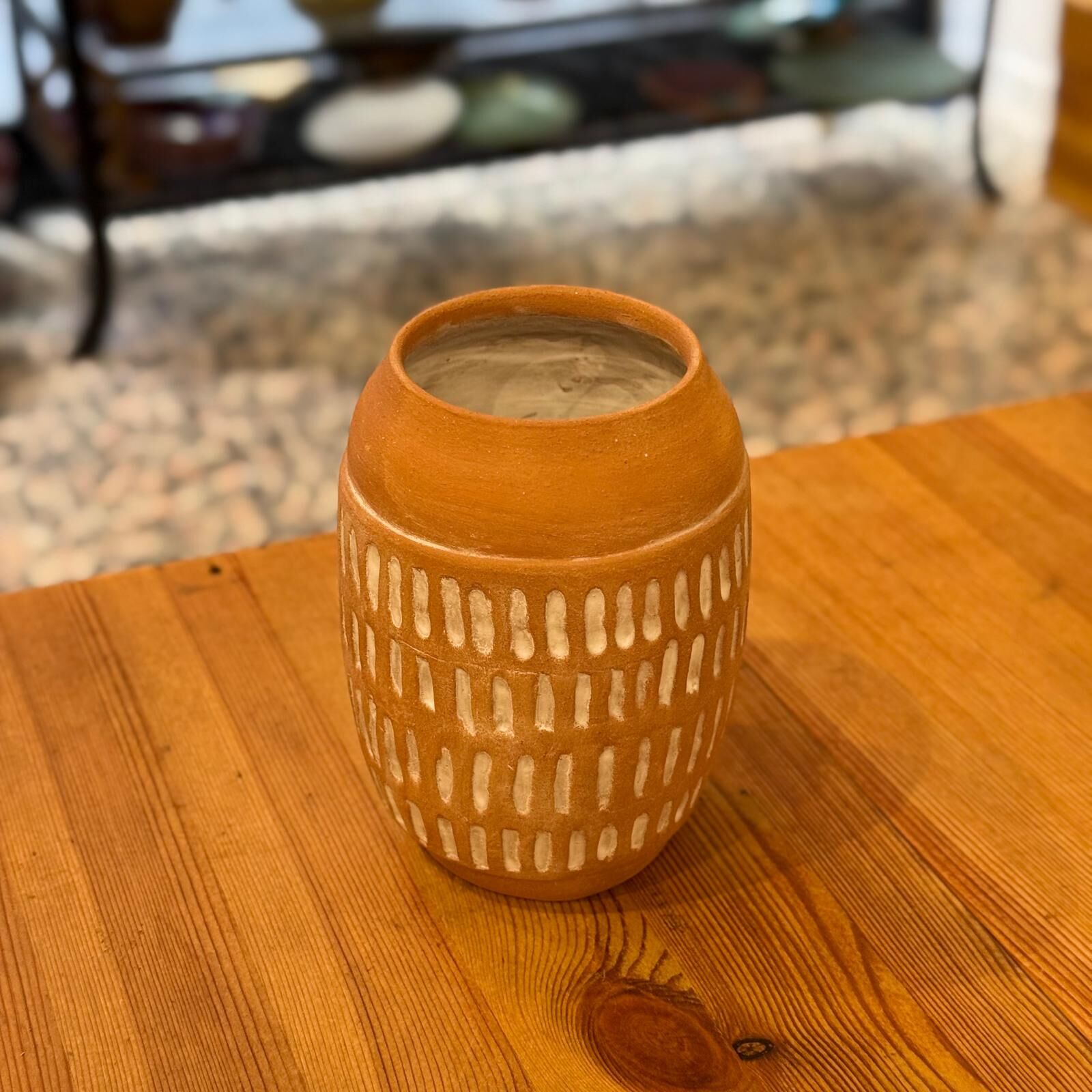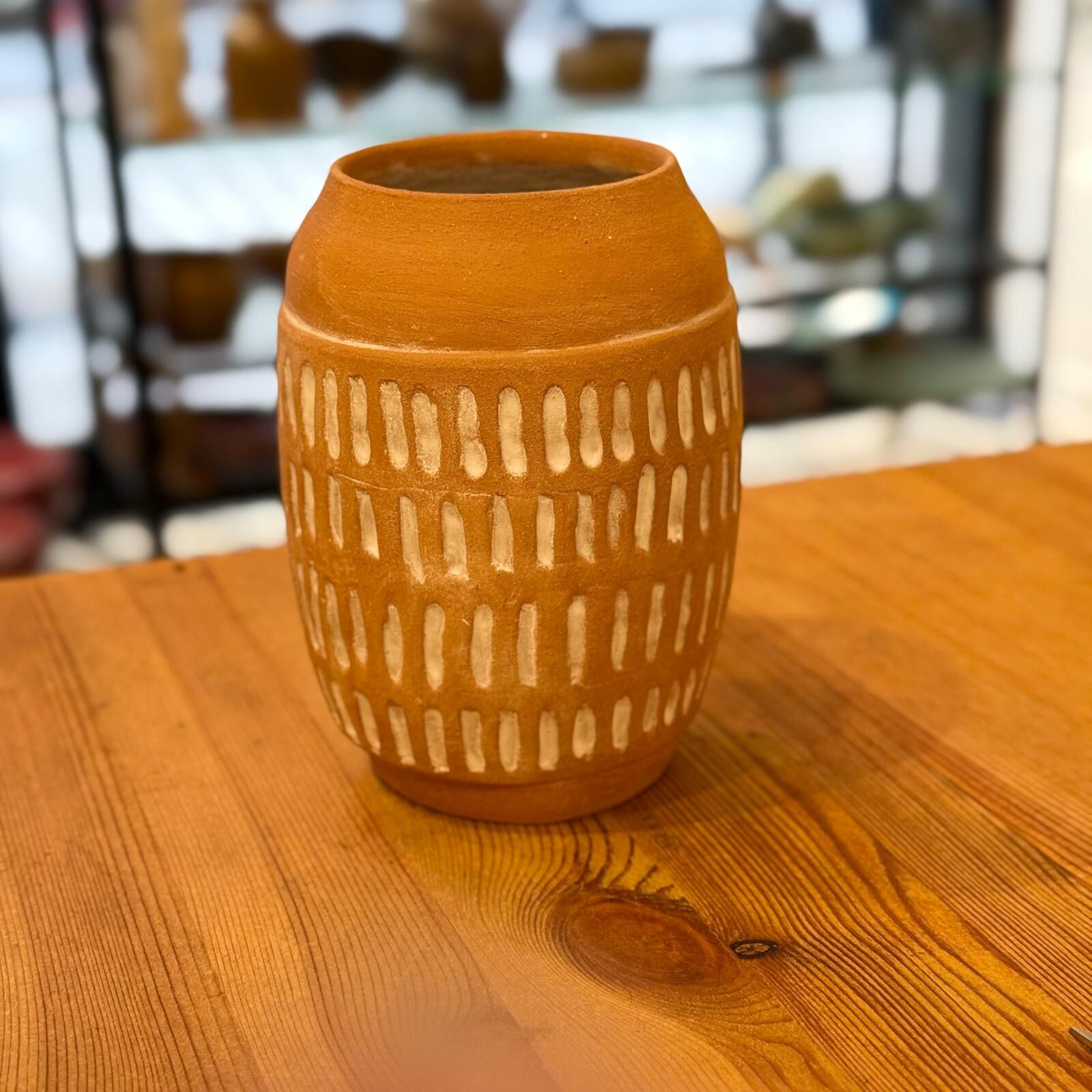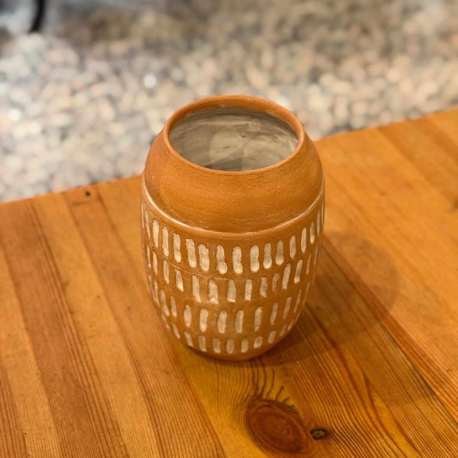 7 cm çapında 13 cm yüksekliğinde desenli toprak renginde seramik vazo.