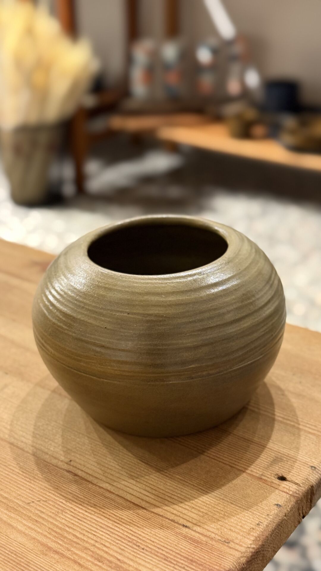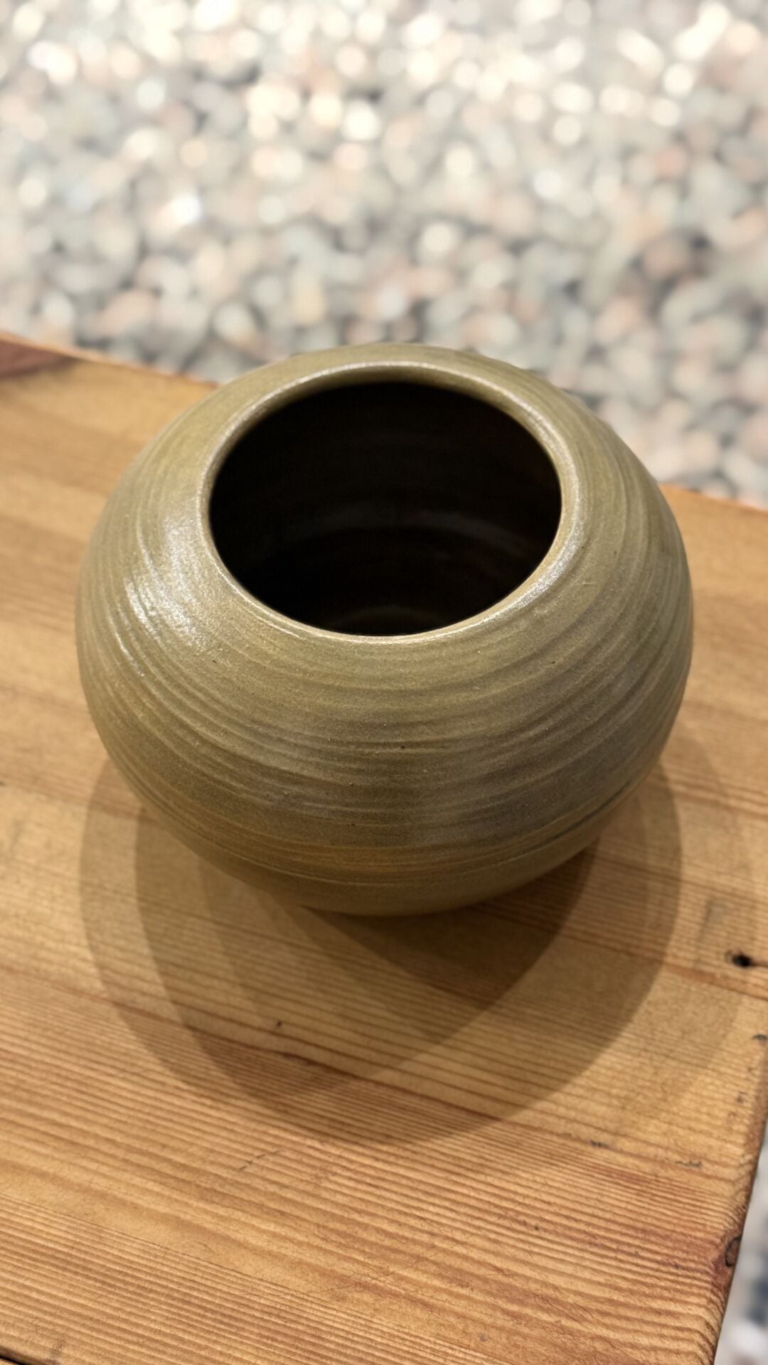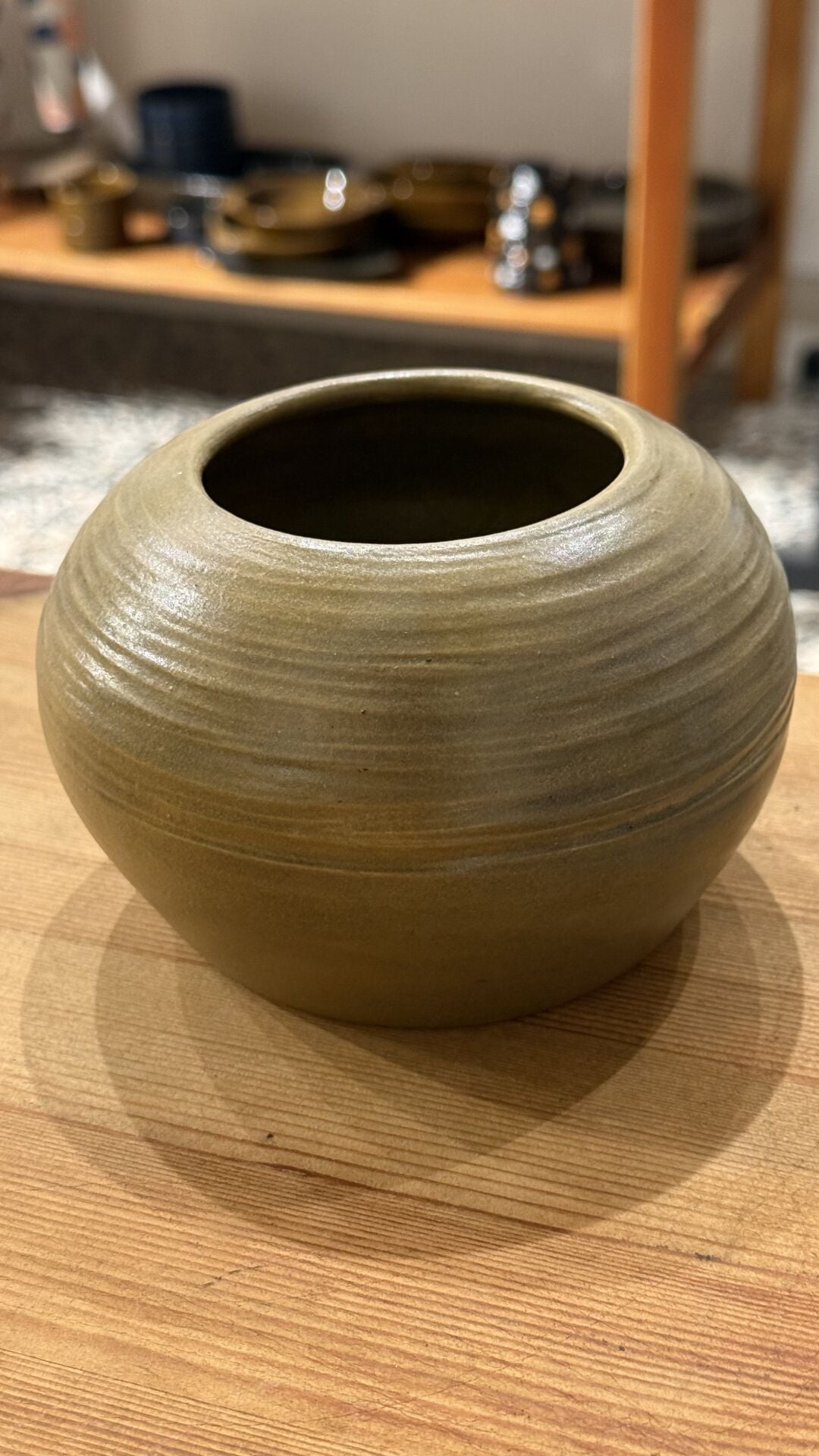 9 cm çapında 9 cm yüksekliğinde yağ yeşili oval form seramik vazo.